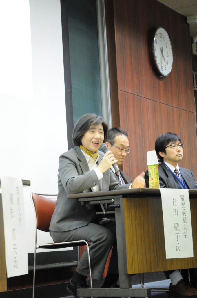 第二部では、まず本専攻を構想した有川節夫総長が、学術情報基盤整備の観点から専攻開設の意義について語ったのち、パネルディスッカションが行われました。ここでは、講演者のお二人に加えて、慶應義塾大学文学部の倉田敬子教授、専攻専任予定教員である三輪宗弘教授、冨浦洋一准教授の5名が、吉田素文附属図書館副館長の司会のもとで、図書館情報学やアーカイブズ学の現状を整理し、未来を展望しながら、新専攻の課題について議論を交わしました。フロアからも活発に意見や質問が出され、新専攻のこれからについて率直な意見交換がなされたことは、新専攻に対する期待の大きさの表れといえます。