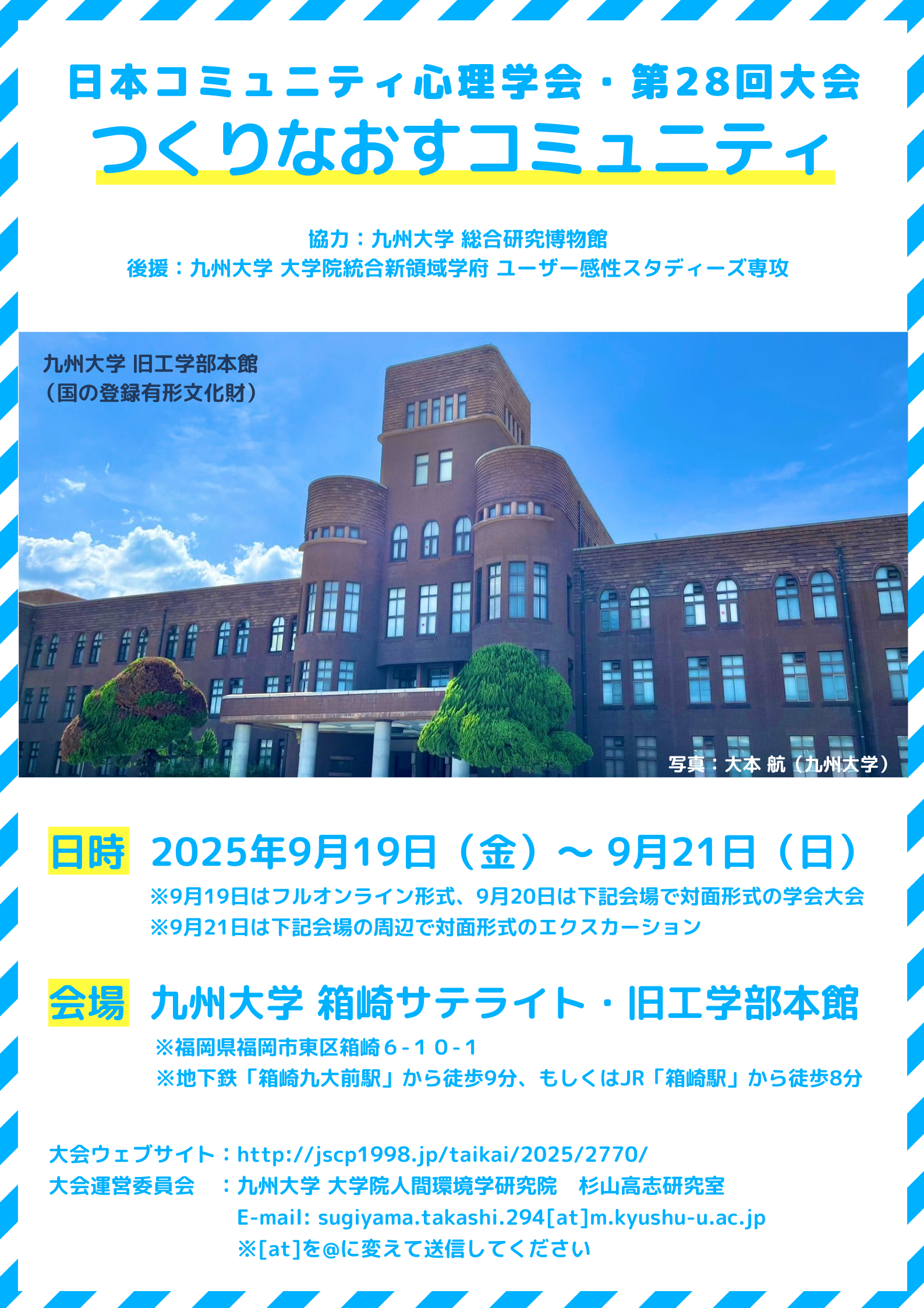 統合新領域学府・ユーザー感性スタディーズ専攻が後援する、日本コミュニティ心理学会 第28回大会「つくりなおすコミュニティ」(大会長:杉山高志 准教授)が、2025年9月19日(金)~2025年9月21日(日)に開催されます。