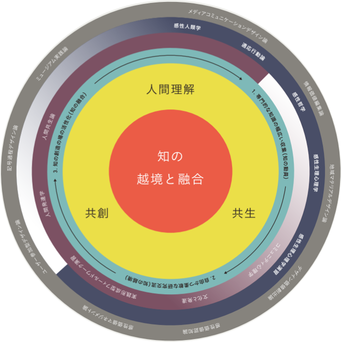 ユーザー感性スタディーズ専攻では、芸術工学研究院、人間環境学研究院、総合研究博物館という学際性の強い研究院が連携してダイナミックコアを形成しています。さらに総合大学である九州大学のリソースを動員しながら「感性」をキーワードに、「人間理解」「共生」、「共創」の3つの切り口から多様な専門性を越境・融合することで、新しい越境・融合型の専門家を育成します。